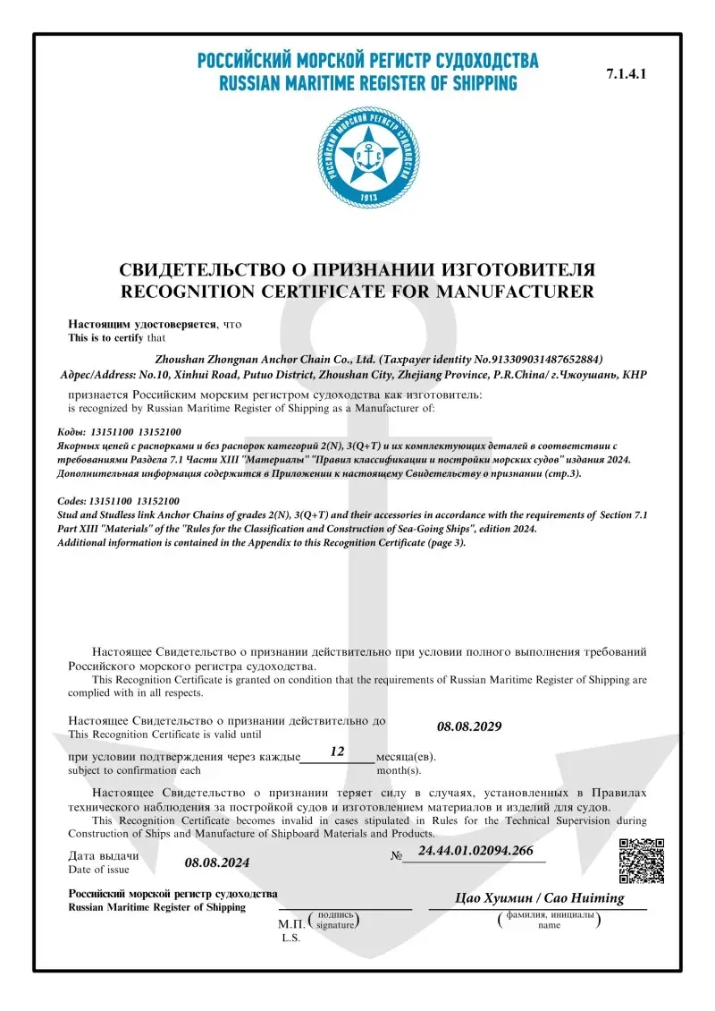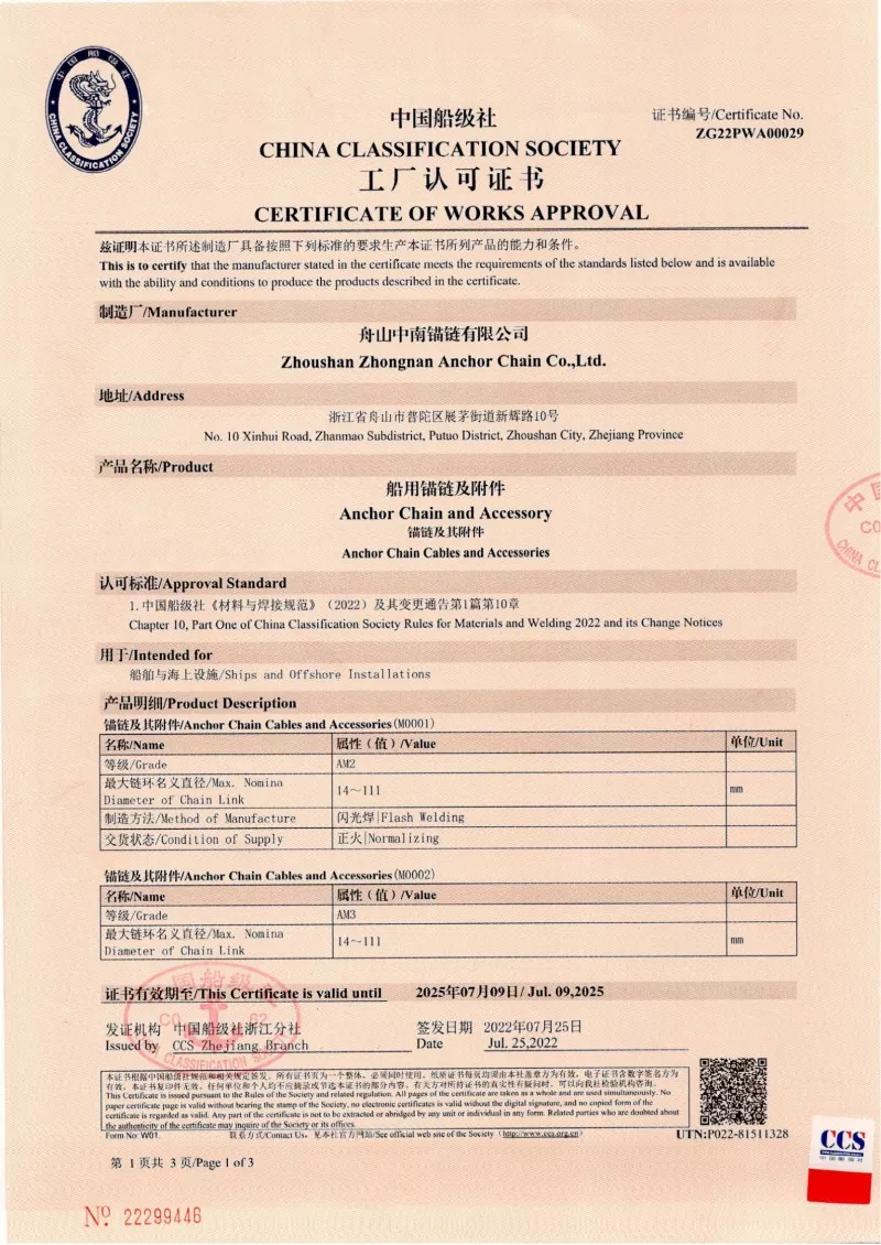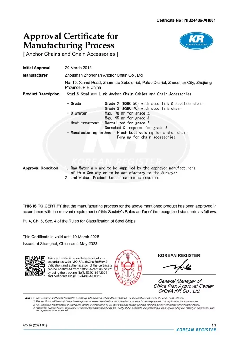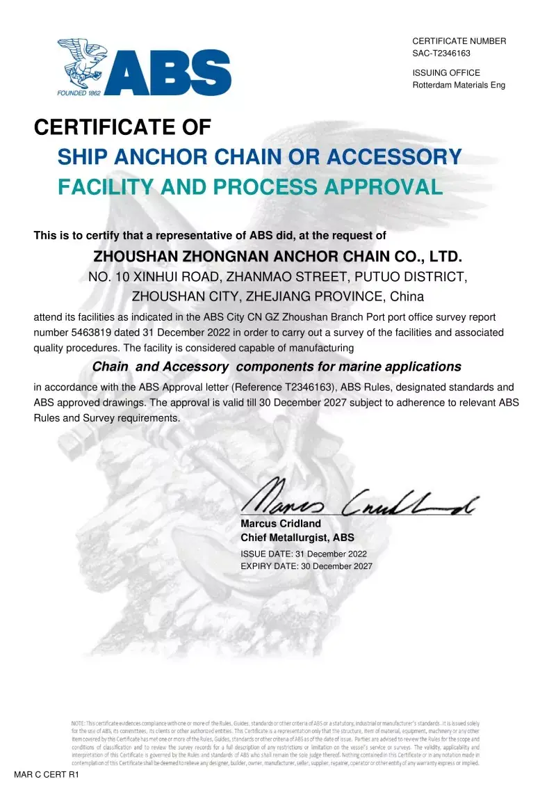 예. 공장에서 생산 된 모든 체인에는 CCS, ABS, DNV, BV, LR, NK, RINA, KR 및 RS와 같은 주요 국제 분류 사회의 인증이 제공됩니다. 이 인증서는 IACS 및 ISO 표준에 대한 체인 준수 및 증거 부하 및 부하 사양을 입증합니다.