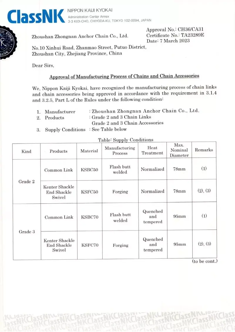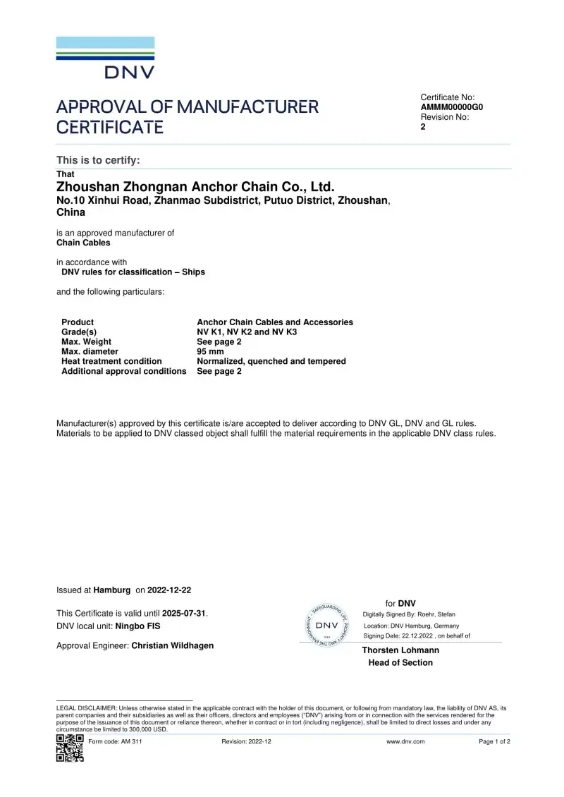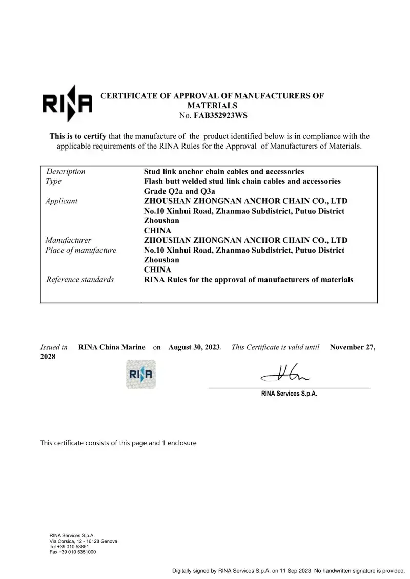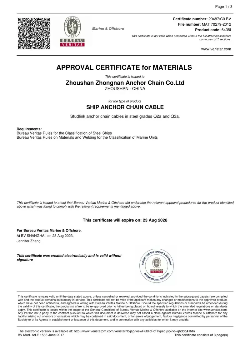 예. 공장에서 생산 된 모든 체인에는 CCS, ABS, DNV, BV, LR, NK, RINA, KR 및 RS와 같은 주요 국제 분류 사회의 인증이 제공됩니다. 이 인증서는 IACS 및 ISO 표준에 대한 체인 준수 및 증거 부하 및 부하 사양을 입증합니다.